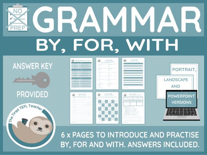 A simple, no-frills set of worksheets for practising by, for and with. Includes an explanation and examples of by, for and with, multiple choice questions, sentence unscramble, sentence completion and speaking activities and a homework worksheet (seven pages including answer key). Includes Landscape and adapted PowerPoint version