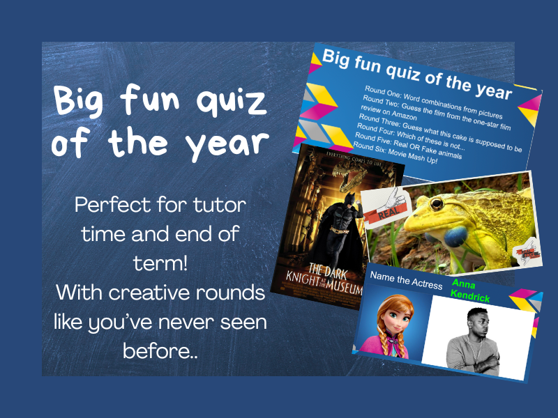 Fun quiz to end the year, perfect for tutor time or assemblies. Appropriate for ages 11+. Brand new, creative rounds like you’ve never seen before. Use for tutor time, assembly or as a part of a team building day.