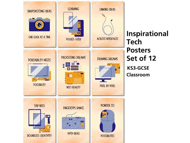 The posters use clear, modern designs to reinforce enthusiasm for technology and encourage a focused, motivated classroom atmosphere without distraction.