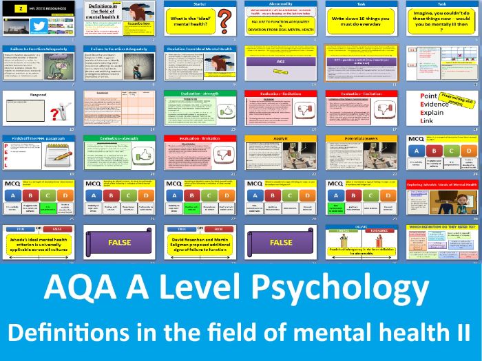 We start with a discussion on what ‘normal’ is, we look at examples of people that might be considered different or unusual and relate this to the definitions in psychology. Application task, evaluation task and follow-up discussion, video, MCQs, true or false questions, 6 mark A02 exam style question with indicative points, PEEL paragraph practice, debate question and we finish with a box plenary.