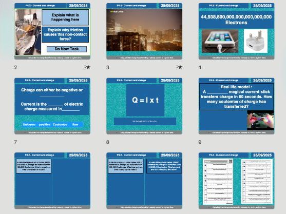 AQA Physics, P4 Electricity, Current and Charge, Q=It, GCSE Physics, KS4 Science, AQA 9-1, Physics Lesson PowerPoint, Electric Circuits, Charge Flow, PlanetReynolds, AI Marking