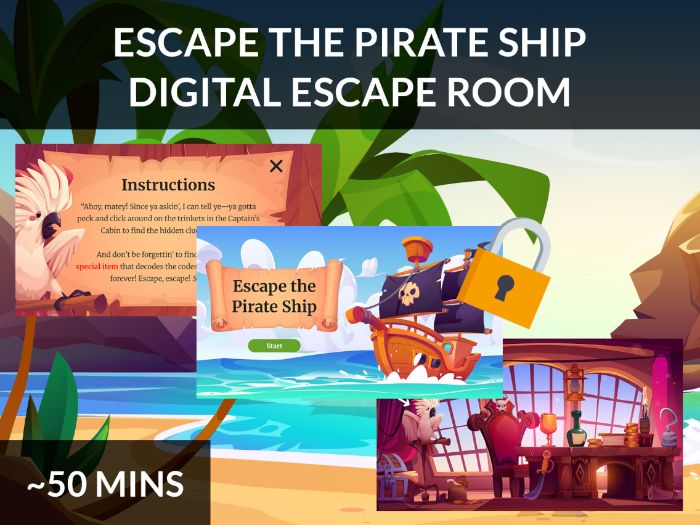 There are 6 puzzles for students to solve, all with the overarching theme of escaping from a pirate ship.
