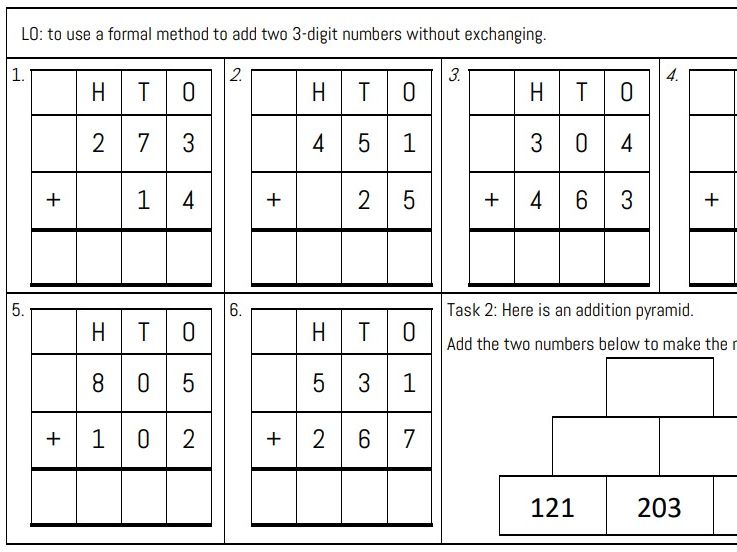 Differentiated activity for introducing / revising column addition with year 3/4s. Answer sheet for each activity. Includes fluency, missing digits and word problem tasks. Two work sheets per page.