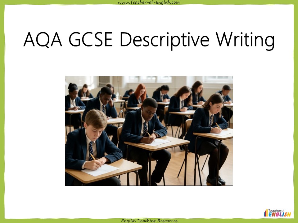 This resource is made up of five lessons, an editable 126-slide PowerPoint and 32 worksheets. It is a complete unit of work for Year 10/11 students who are following the AQA GCSE English Language course. It explains how to produce a piece of effective descriptive writing as required by the AQA GCSE English Language exam.