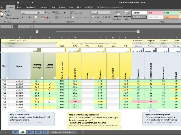 Track your student's grade using Excel, change the assessment type, weightings, adjust the % needed per grade this should save you some time multiple classes - easy to edit for your own needs