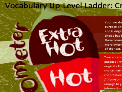 A Nando's themed vocabulary up-level grid, showing students how to move through stages in using vocabulary for effect ranging from mild to extra hot.