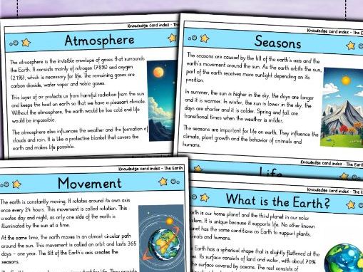This knowledge card set includes 10 cards that provide an overview of the Earth. It covers key topics such as the planet’s structure, layers, atmosphere, ecosystems, and the role of Earth in sustaining life. The text and images were generated with AI.