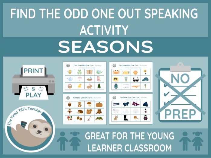 4 pages each containing 3 sets of four images. Students need to find the odd one out. Answers not included because the idea is for the students to make connections between the images and some may have more than one option for the ‘odd one out’. For example, if the images are sun, sunblock, sunglasses and baseball cap the odd one out could be baseball cap because it doesn’t contains the word sun or sun because the others are things you use to protect yourself from the sun.