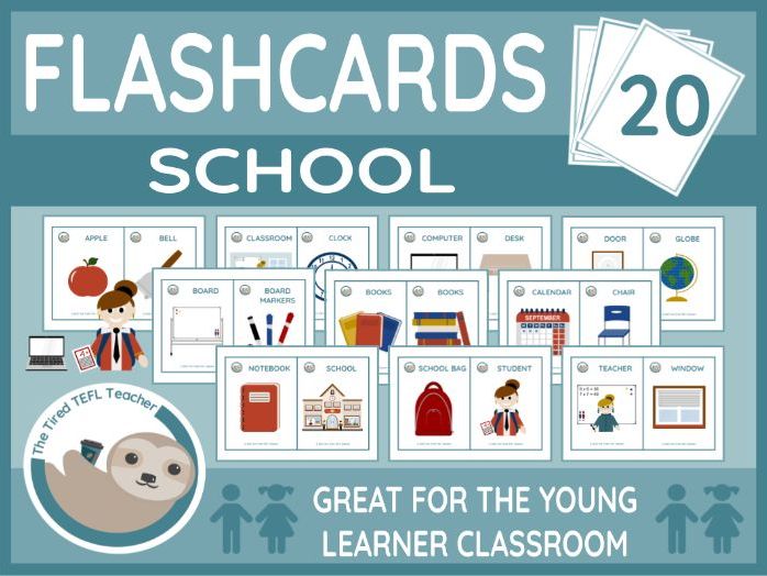 Vocabulary: apple, bell, board, board markers, books x 2, calendar, chair, classroom, clock, computer, desk, door, globe, notebook, school, school bag, student, teacher and window.