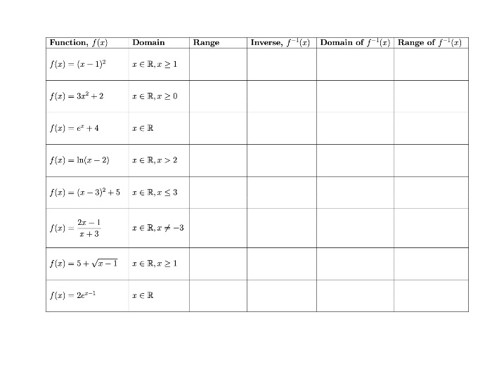 Given a function and its domain, students find the range of the function, the the inverse function and the domain and range of the inverse function. A grid with lots of examples for students to complete. Some extension questions too. Answers given.