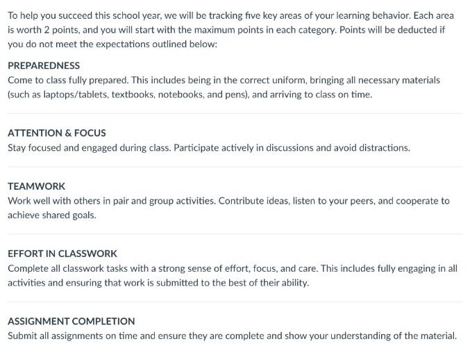 Effort in Classwork: Evaluating the completion and quality of in-class tasks.