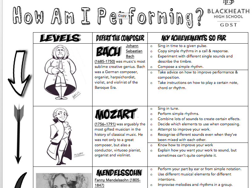 Fun ‘Beat the Composer’ level descriptors for years 7-9 at KS3. Can be used with level numbers 9-1 or A*-E
