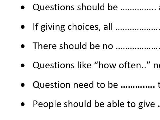KS3 statistics. What makes a good questionnaire? There is a fill the blanks activity and powerpoint with areas for discussions.