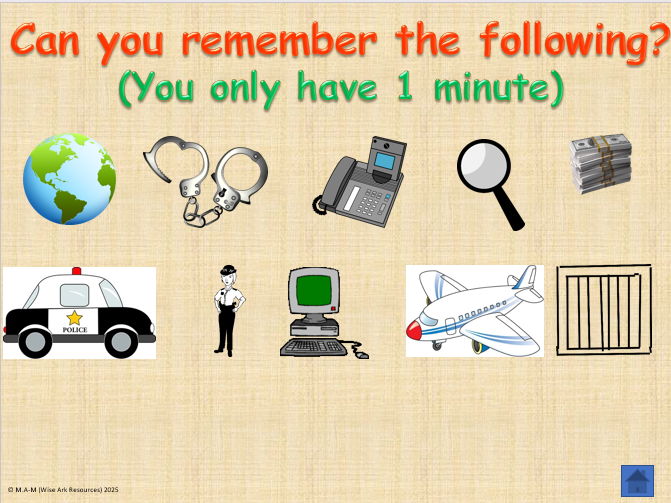 There is a set of slides each of which features 10 different pictures-that will disappear one by one so that after a minute all are gone. (there is a second slide with them all on to check after a chance to recall the images)