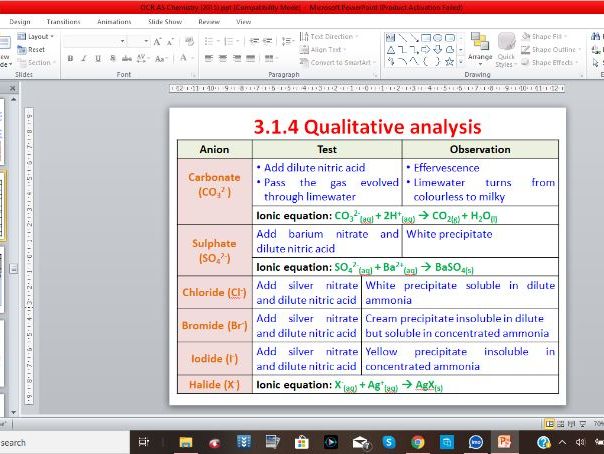 The presentations comprehensively cover the OCR AS/A-level (Year 1) Chemistry specification and have been written in a revision-friendly format to help pupils revise for their A-level examination. The title for each topic include specification code and the files have been ordered in the same sequence as in the specification. What makes this presentation unique is that the keywords in exam answers that the pupils are awarded marks for have been highlighted in black italicised font. Calculations have been demonstrated in logical steps and explanatory pictures and graphics have been embedded from various external sources.