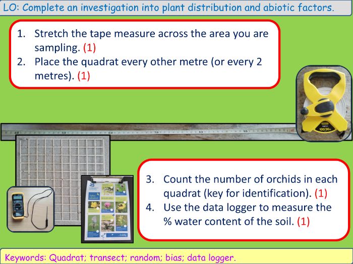 WS 2.3 – apply a range of techniques, including the use of transects and quadrats, and the measurement of an abiotic factor. (in theory)