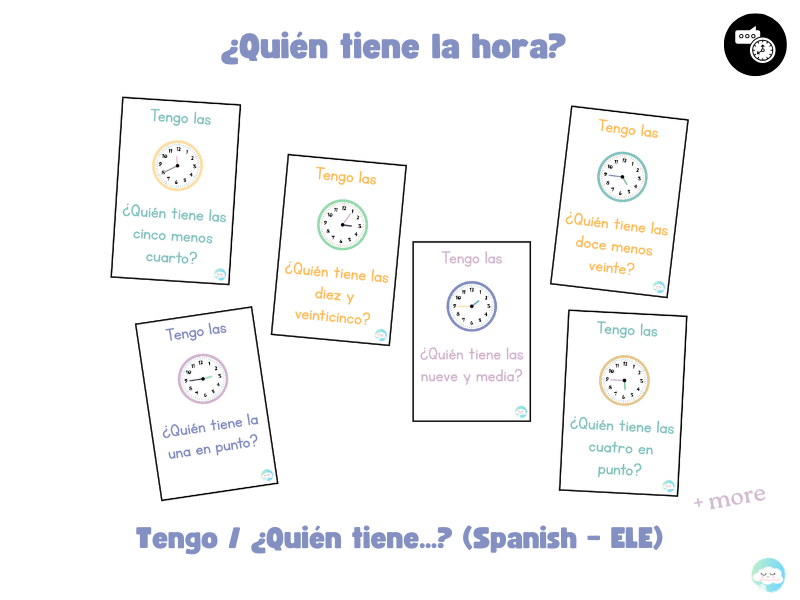 - ¿Quién tiene la / las…? + the time written in Spanish (e.g. ¿Quién tiene las cinco menos cuarto?)