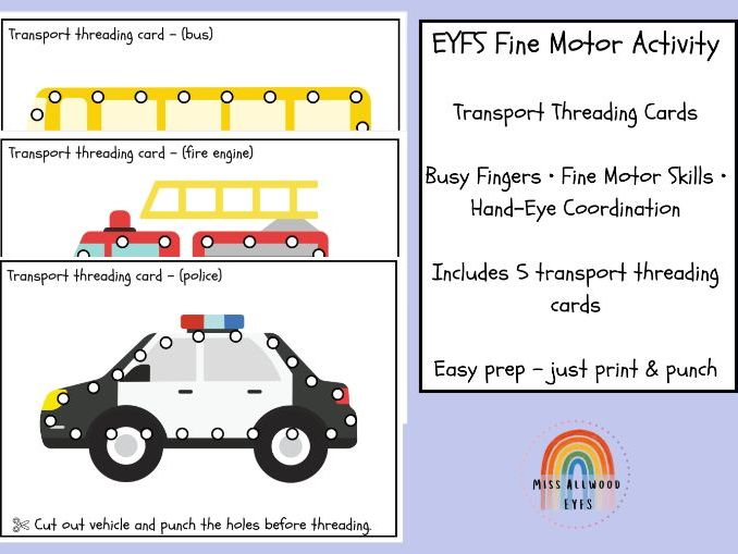 Children can thread around each vehicle using string, wool or laces, making this a perfect independent provision activity.