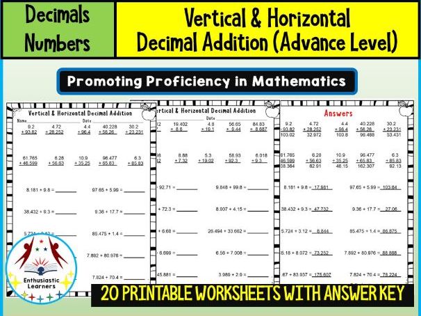 Challenge learners with these advanced Decimal Addition Worksheets in both vertical and horizontal formats. Students practice adding decimals with multiple digits and addends, aligning place values, and solving complex problems that build fluency and accuracy.