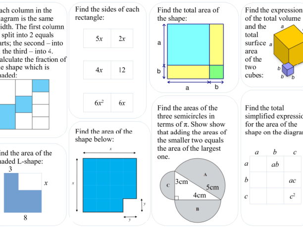 The task shown in the image is a collection of mathematical problems designed to enhance students’ understanding of geometry, algebra, and proportional reasoning through both visual and analytical methods. It involves working with shapes, areas, fractions, and expressions, requiring students to analyze diagrams, perform calculations, and simplify algebraic terms. The problems encourage logical reasoning, spatial visualization, and the application of algebraic rules to solve real-world and abstract mathematical scenarios. By combining diagrams with symbolic representations, the task integrates visual learning with abstract mathematical thinking.