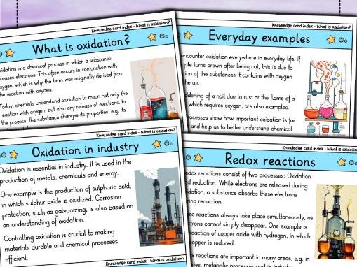 This knowledge card set includes 10 cards that provide an overview of oxidation. It covers key topics such as the process of oxidation in chemical reactions, the role of oxygen in oxidation, how oxidation affects elements and compounds, and its applications in processes like rusting, combustion, and cellular respiration. The text and images were generated with AI.
