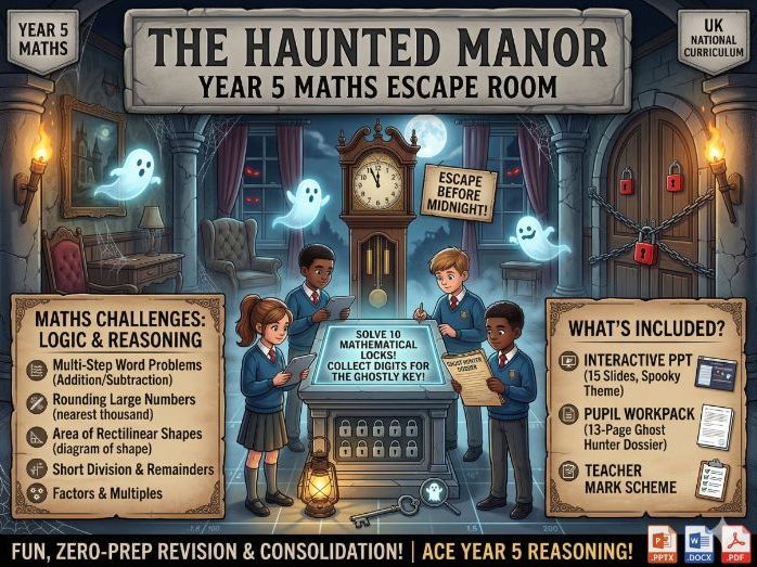 “The Haunted Manor” is a high-engagement Year 5 Maths Escape Room designed to consolidate core National Curriculum objectives through an immersive spooky narrative. Perfect for Halloween, end-of-term treats, or boosting confidence in multi-step reasoning, this resource turns a standard maths lesson into a race against time!