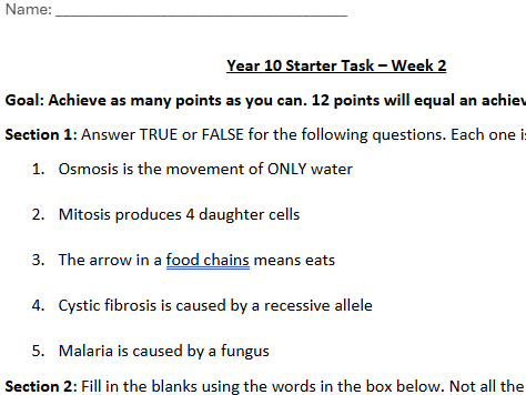 Weekly starter activities for lower ability year 10 students. Competition format to engage them and with a lot of options for answers so they do not have the excuse of leaving it blank