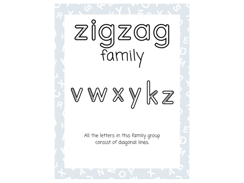 All the letters in this family group consist of diagonal lines. This pack will help the student learn to form the letters v,w,x,y,k and z. For each letter there is a page exploring how to form the letter, things that begin with that letter (colouring in page) and then there is a page where you can practice writing the letter - initially tracing and then writing independently.